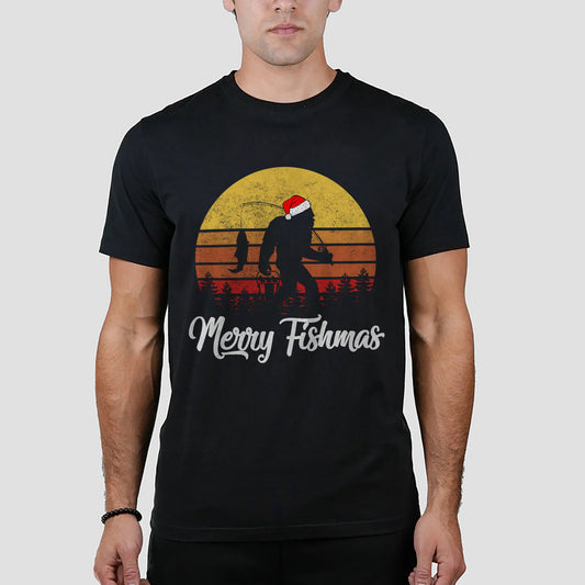 Funny Christmas Fishing Shirt - Merry Fishmas Bigfoot Tee - Holiday Gift for Fishermen – Black – Up To 5XL