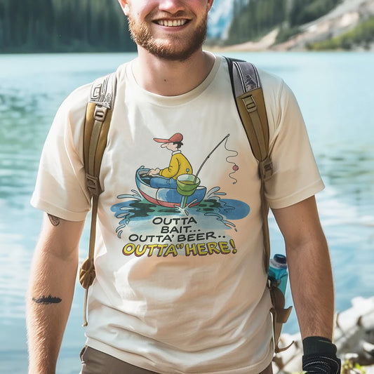 Outta' Bait Outta' Beer Outta' Here Shirt – Funny Fishing Tee – Fisherman Humor Gift – Natural – Up To 5XL