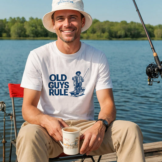OLD GUYS RULE Fishing Shirt – Funny Retro Angler Tee – Humorous Fisherman Gift – White – Up To 5XL