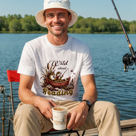 Cute Cottagecore Shirt – Frog and Toad Fishing and Reading Book Tee – White – Up To 5XL