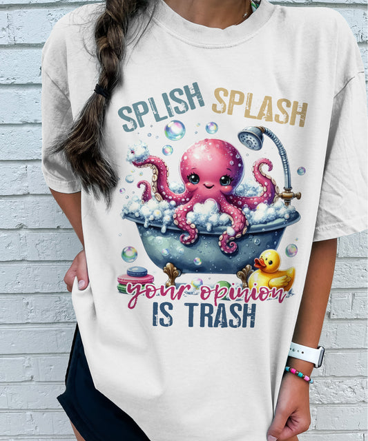Splish Splash Your Opinion Is Trash T-Shirt – Funny Women Sarcastic Tees – White – Sizes Up to 5XL
