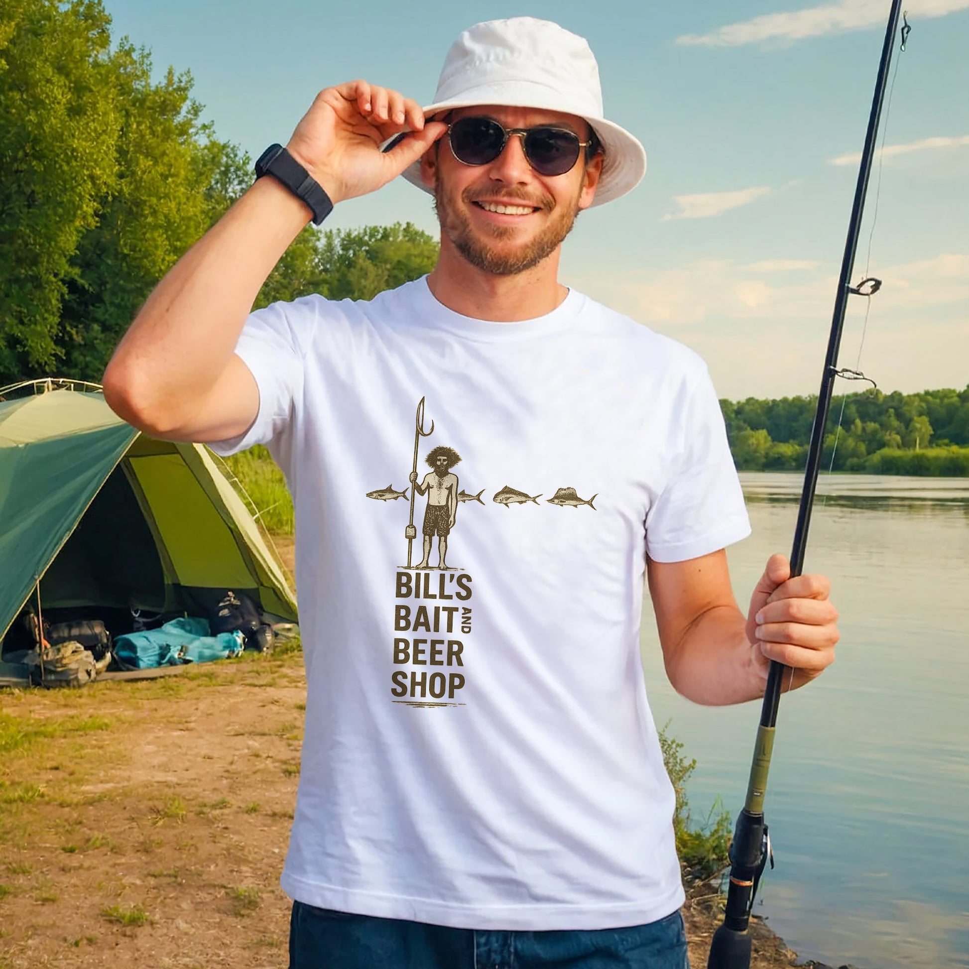 Bill's Bait and Beer Shop Shirt – Funny Fishing Tee – Fisherman Humor Gift – White – Up To 5XL