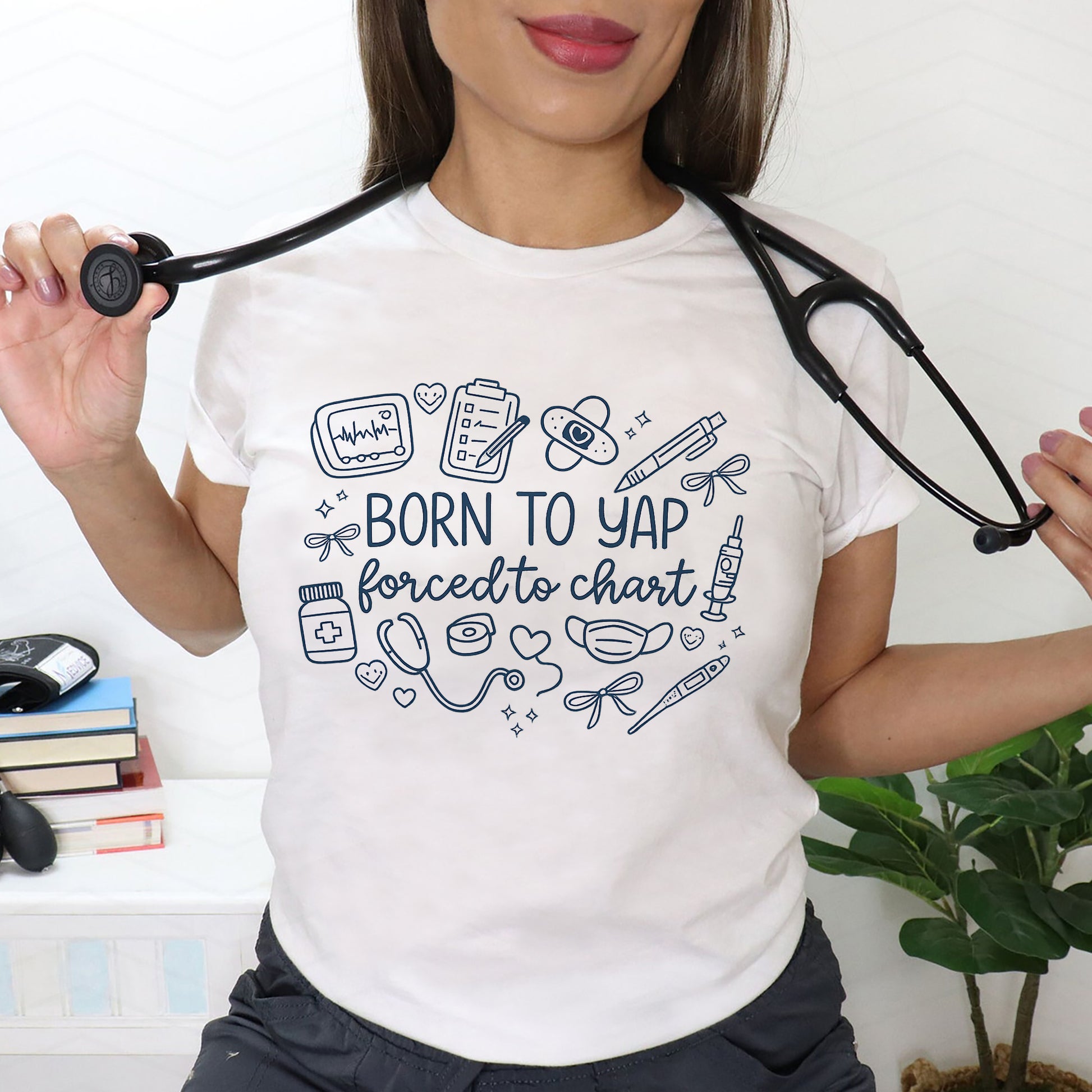 Born to Yap, Forced to Chart T-Shirt - Funny Tees For CNA Nurse-White- Up To 5XL