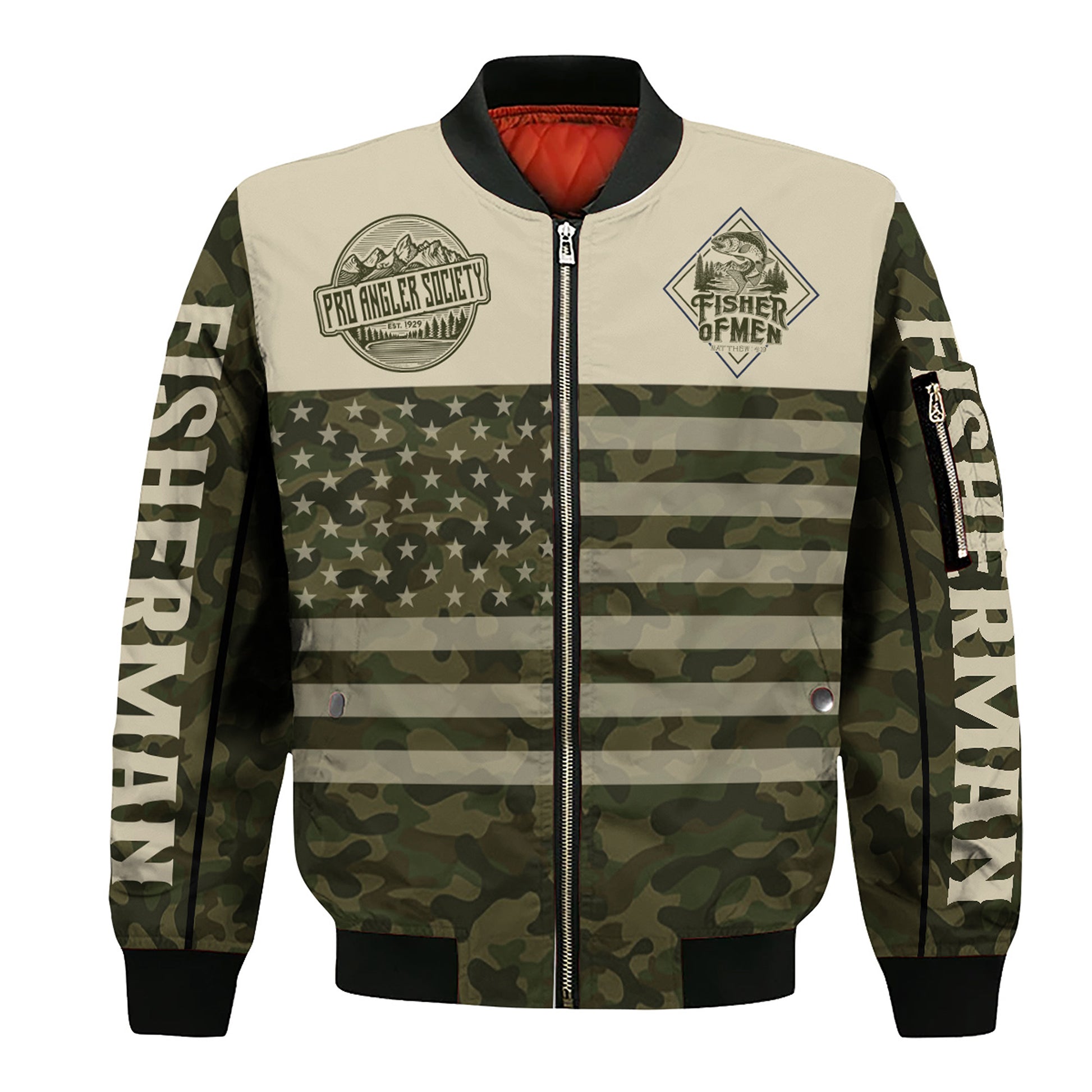 The Christian Fisherman Bomber Jacket – “Come Follow Me” Camo Edition brings together your passion for fishing and your devotion to Christ in one bold design. Inspired by Matthew 4:19, this jacket reminds every believer to live with faith, strength, and brotherhood.