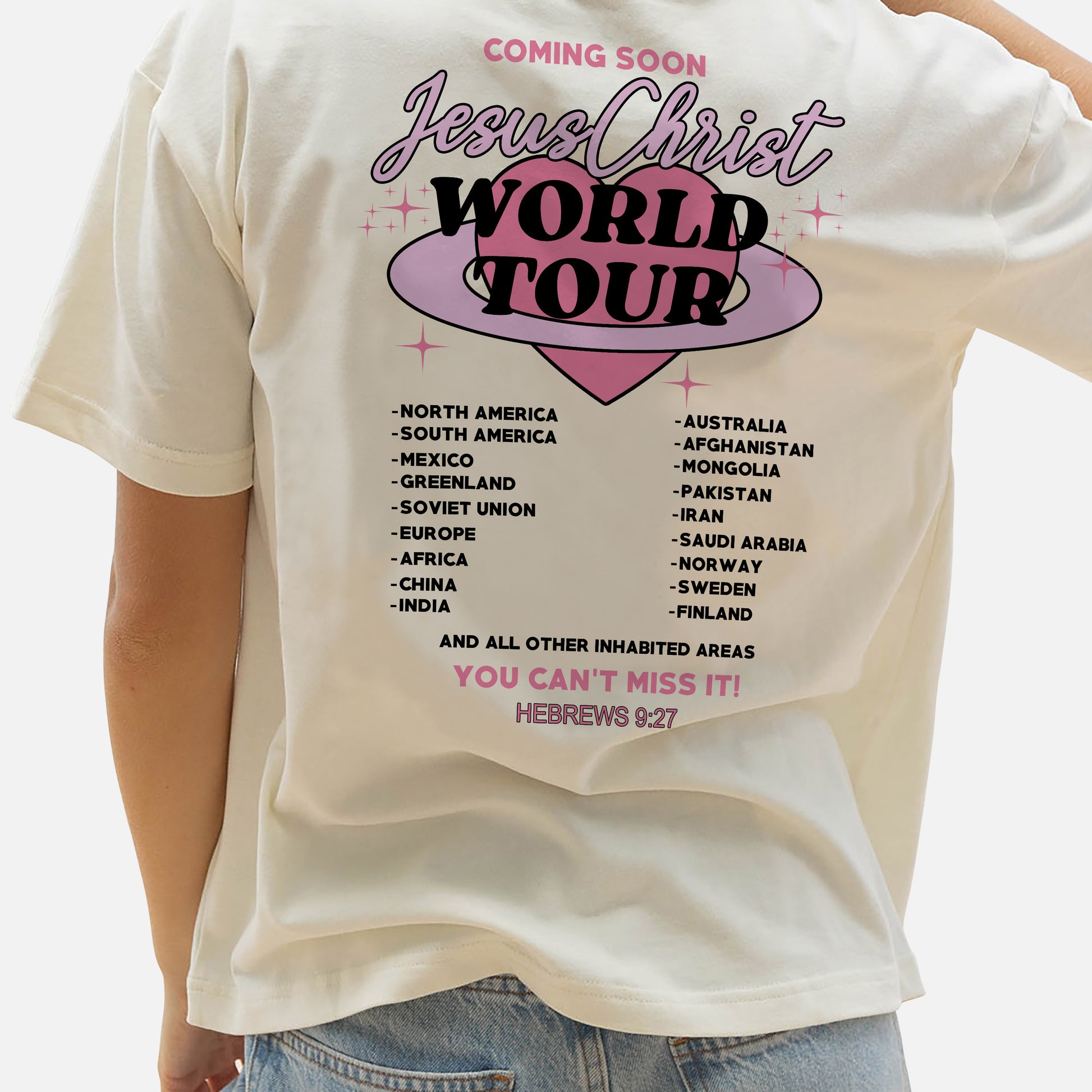 The “Coming Soon – Jesus Christ World Tour” tee reimagines the Second Coming like the most epic tour of all time. Styled like a vintage concert shirt, this design is part parody, part prophecy, and fully rooted in faith—with a wink.