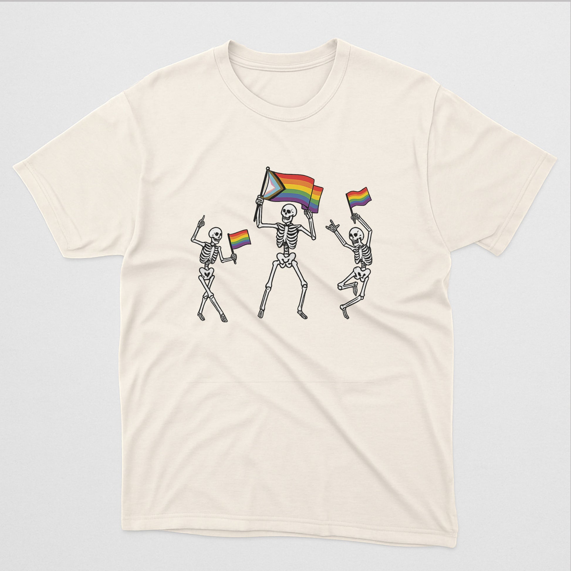 Dancing Skeleton Pride Month T-Shirt – Funny LGBTQ Pride Mens Shirts – Natural - Up To 5XL