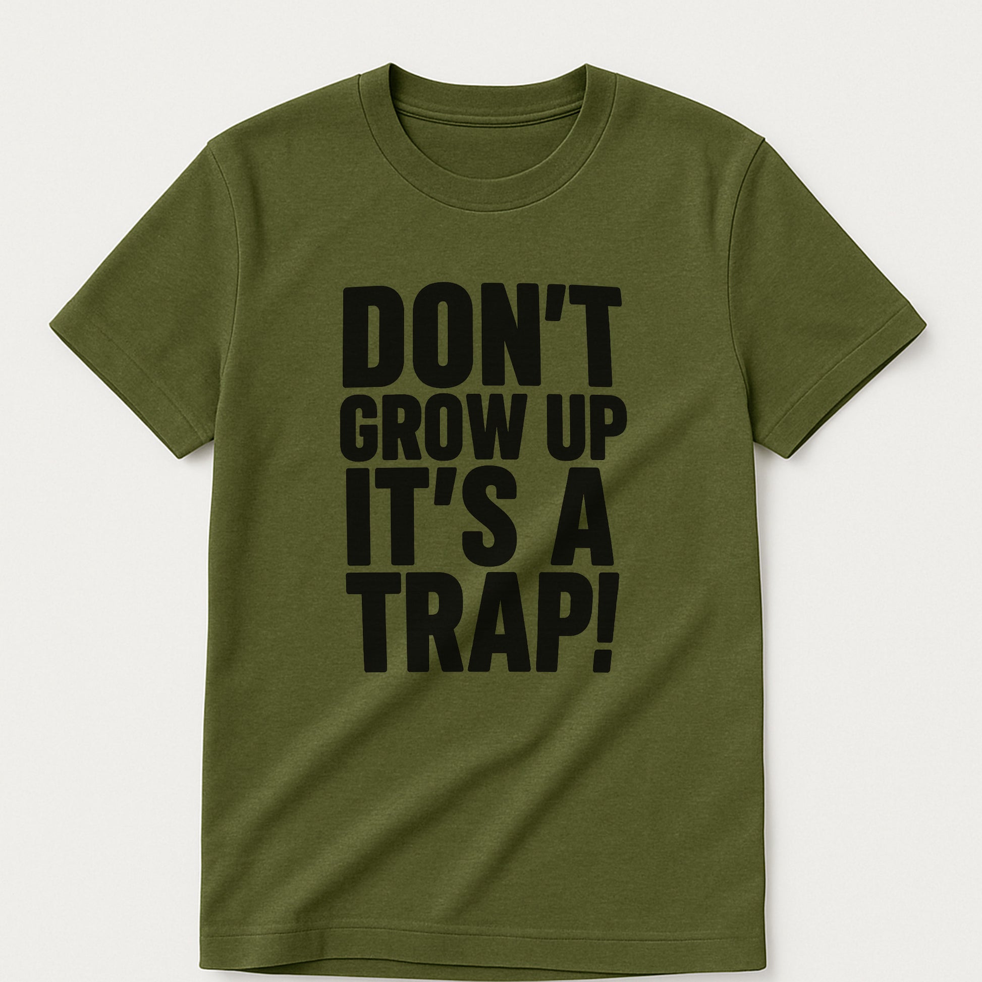 Adulting is overrated—and this shirt knows it. The “Don’t Grow Up It’s a Trap!” T-shirt is perfect for anyone who’d rather stay young at heart. Featuring bold black text on a military green tee, it blends humor and truth into one sarcastically stylish package. Ideal for birthdays, lazy weekends, or just surviving adulthood with a grin. Made from soft, breathable cotton, it’s comfort you can wear while avoiding responsibilities.