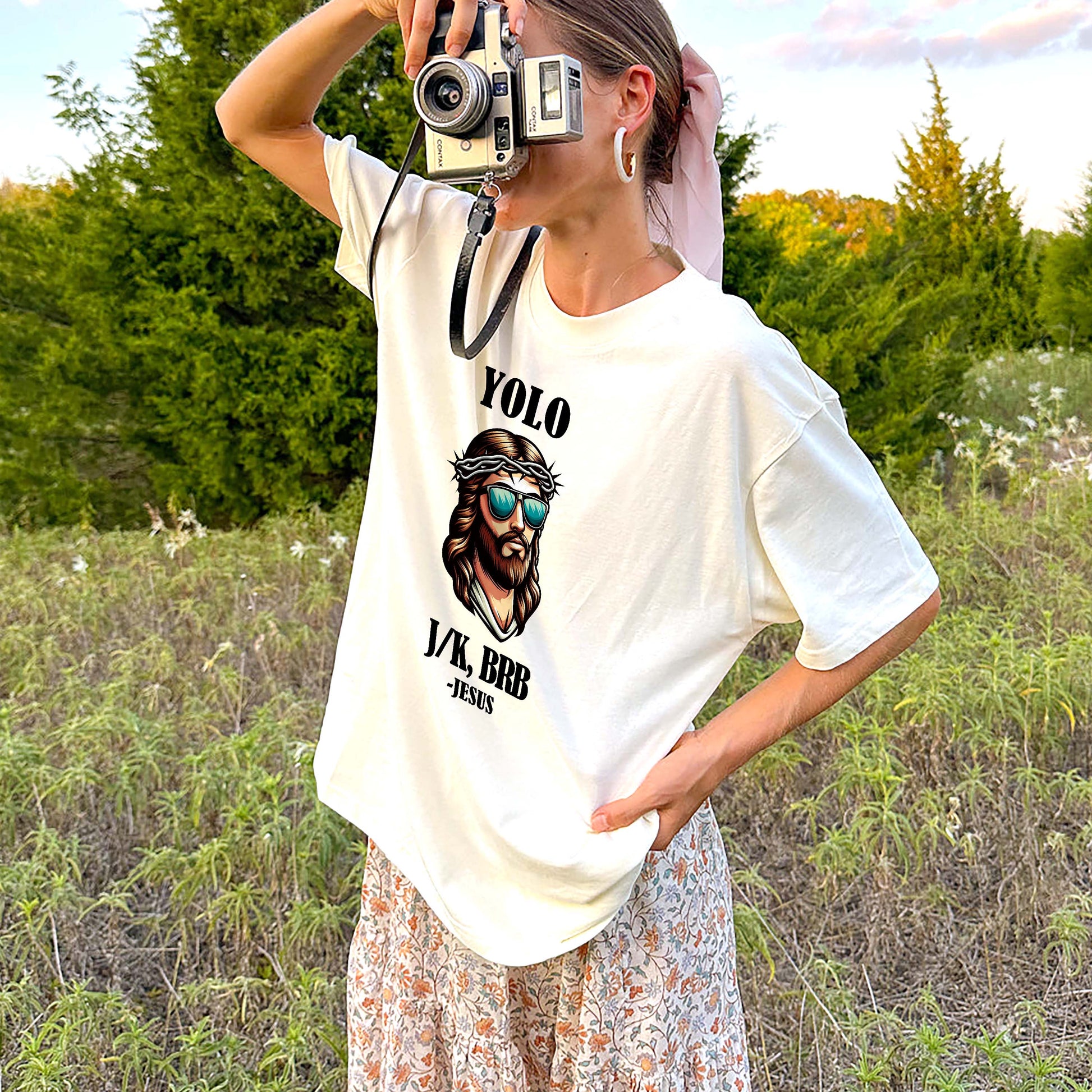Funny Christian Shirt – YOLO JK BRB Jesus – Meme Faith-Based Humor Tee – Natural – Up To 5XL