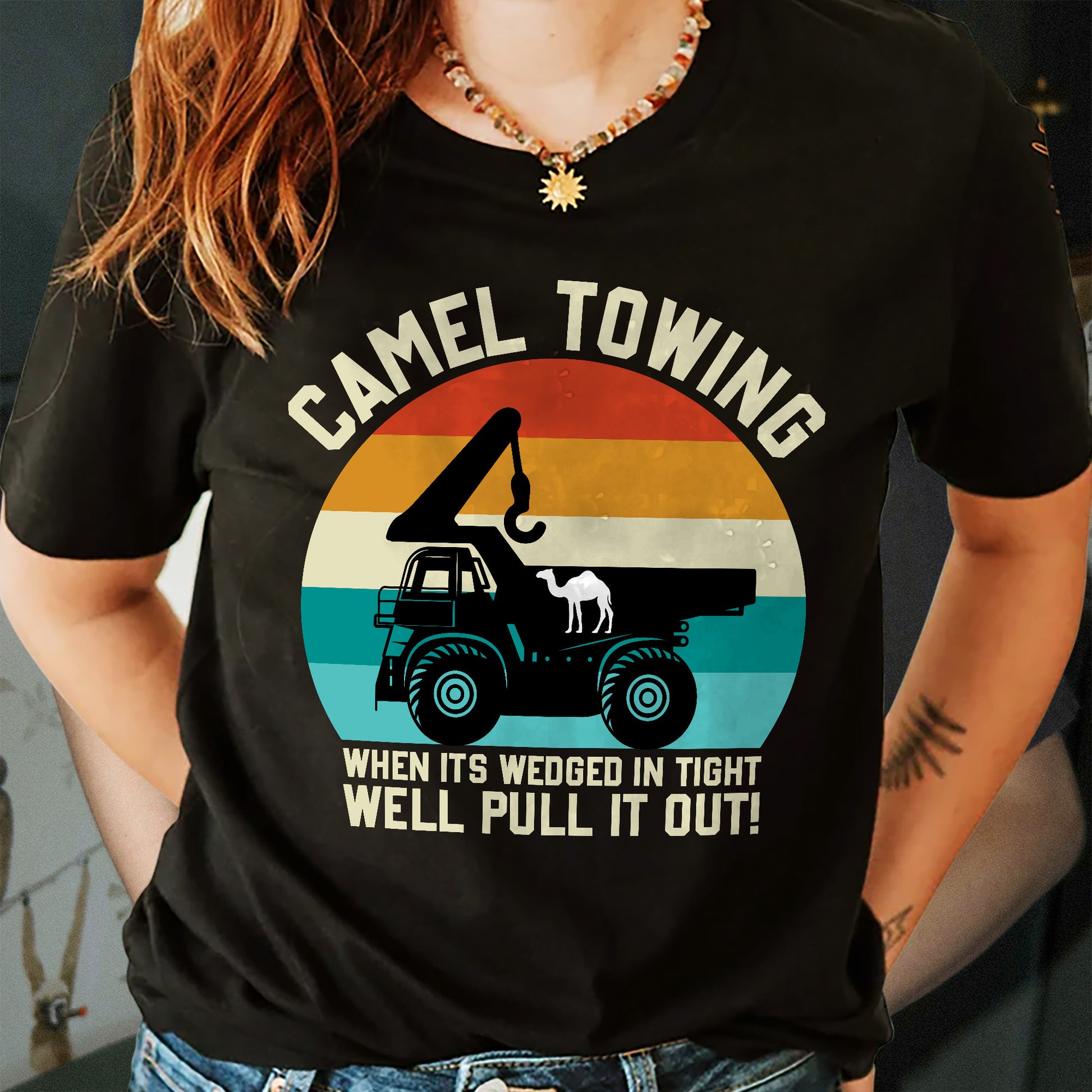 Funny Towing Shirt – Camel Towing When It's Wedged In Tight We'll Pull It Out – Vintage Mechanic Humor Tee – Black – Up To 5XL