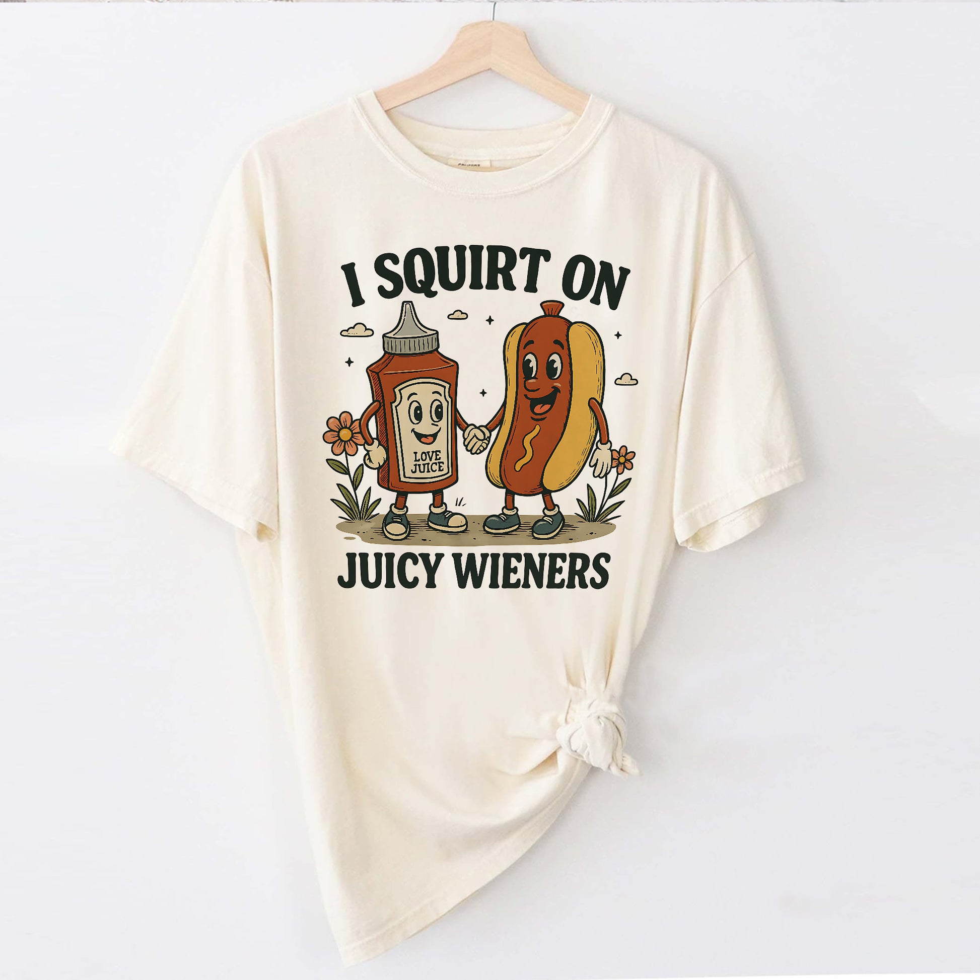 This “I Squirt on Juicy Wieners” tee is for the kings and queens of the cookout, backyard comedians, and those who know a good hot dog joke when they see one. With playful innuendo and grill-side confidence, this shirt is the perfect conversation starter — whether you're flipping franks or just bringing the laughs.
