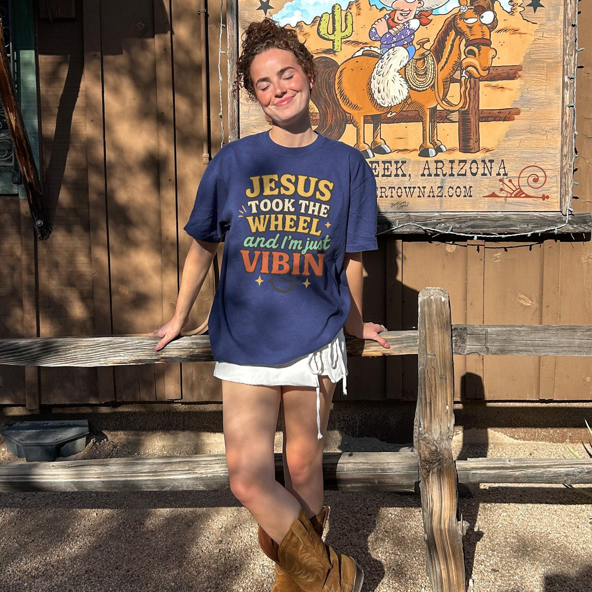 Jesus Took The Wheel and I’m Just Vibin’ T-Shirt - Funny Jesus Shirt For Christians- Navy- Up To 5XL