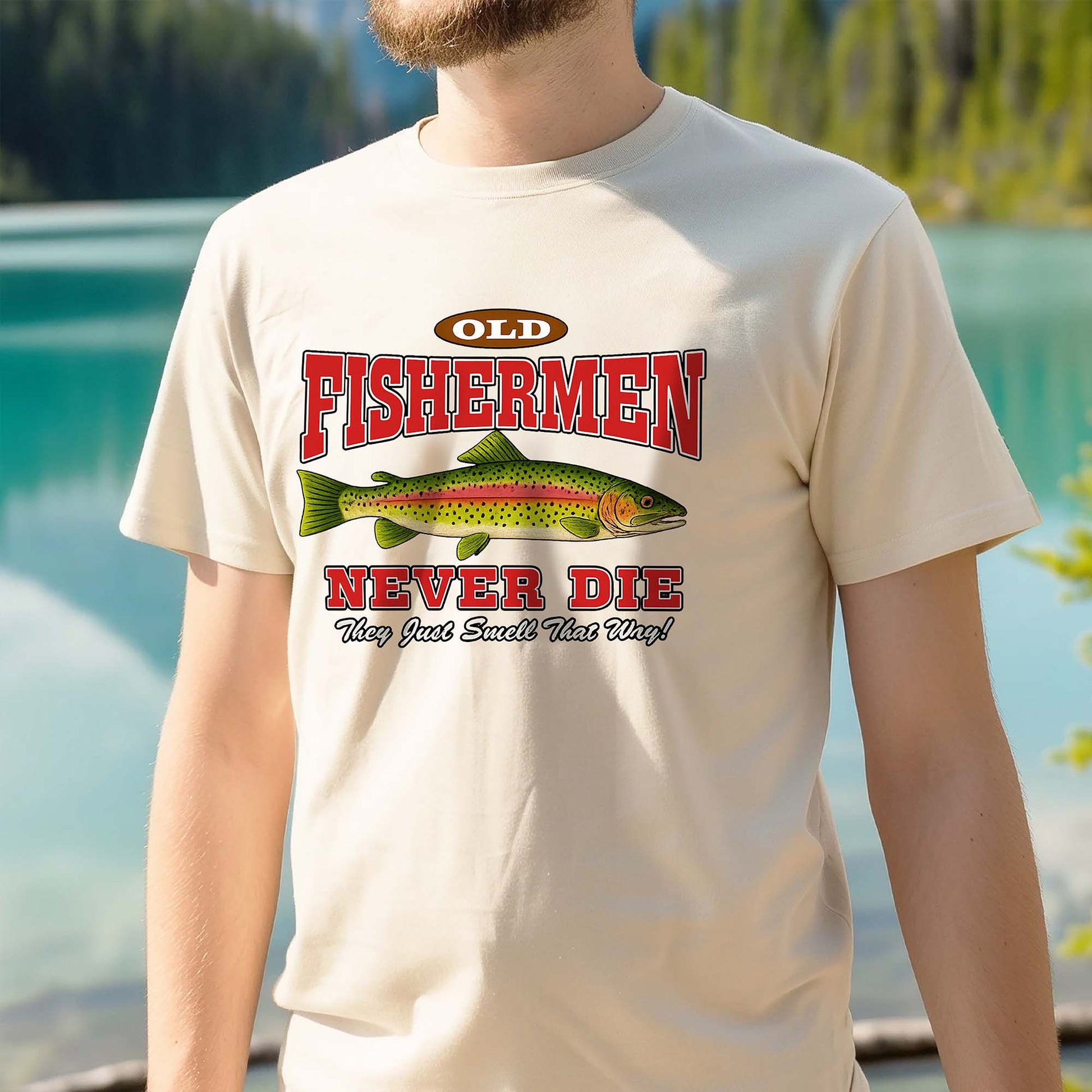 Old Fishermen Never Die They Just Smell That Way Shirt – Funny Trout Fishing Tee – Natural – Up To 5XL