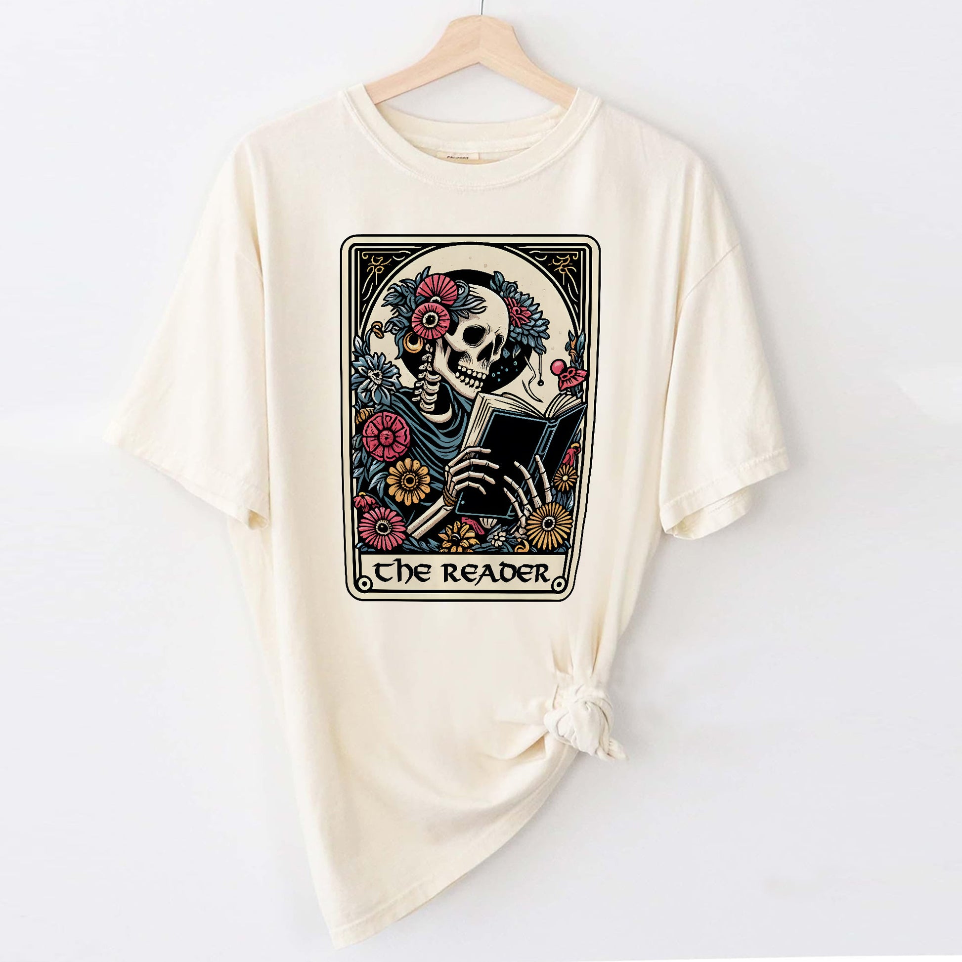 Show off your spooky bookish side with "The Reader Card" design, featuring a tarot-style skeleton deeply immersed in reading. Perfect for readers who love dark humor, gothic vibes, or Halloween flair all year round. Great gift idea for bibliophiles, tarot lovers, and fans of skeleton art. Soft, comfy, and available up to 5XL.