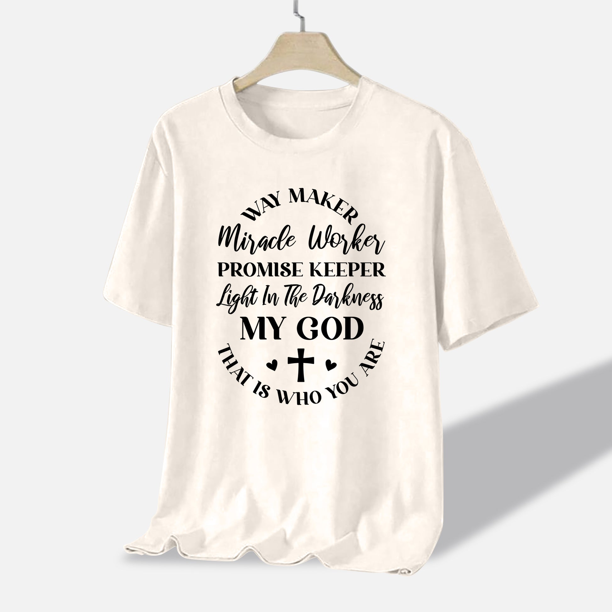 Declare your faith boldly with the “Way Maker, Miracle Worker, Promise Keeper, Light in the Darkness” tee – inspired by the powerful worship anthem sung in churches around the world.